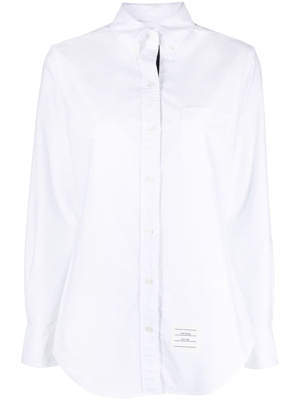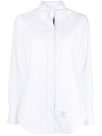 button-down cotton Oxford shirt A penchant for school uniforms informs much of Thom Browne's aesthetic. The result is classic pieces like this Oxford shirt, realised in white cotton. The brand adds signature touches with the name tag patch at the front, and RWB stripe trims at the button fastenings. Highlights - White - Cotton - Logo patch to the front - Pointed flat collar - Signature grosgrain loop tab - Front button fastening - Long sleeves - Buttoned cuffs - Chest patch pocket - Curved hem Made in Italy Composition Cotton 100% SIZE & FIT Model measurements Height 5 ft 10 in(1.78 m) Bust/Chest 31.49 in(80 cm) Hips 35.03 in(89 cm) Waist 23.62 in(60 cm) FittingInformation Designed for a slim fit that sits just away from the body offering a close yet comfortable fit Made from a midweight non-stretch fabric This piece fits true to size – take your usual size Washing instructions Dry Clean Only