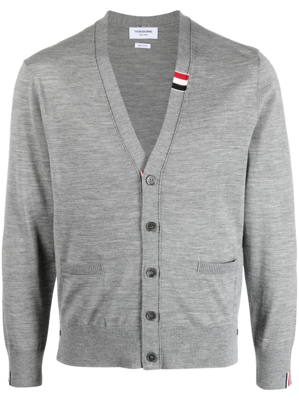 button-up cardigan One of Thom Browne's most recognisable motifs, the RWB grosgrain stripe trim is seen throughout the designer's collections. The iconic detail appears on the V-neck and nape of this light-grey cardigan. Highlights - Light grey - Virgin wool blend - Fine knit - Rwb stripe - V-neck - Long sleeves - Two front patch pockets - Straight hem Made in Italy Composition Virgin Wool 99%, Polyamide 1% SIZE & FIT Model measurements Height 6 ft 2 in(1.89 m) Bust/Chest 37.79 in(96 cm) Hips 37 in(94 cm) Waist 29.92 in(76 cm) FittingInformation Designed for a slim fit, offering a comfortable fit that sits just away from the body Made with a lightweight knit, this piece offers some stretch This piece fits true to size – take your usual size Washing instructions Hand Wash