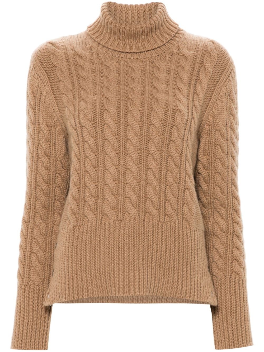 cable-knit cashmere jumper Highlights - Camel brown - Cashmere - Cable knit - Roll neck - Long sleeves - Ribbed cuffs and hem - Buttoned cuffs - Short side slits - Signature stripe detail to the rear Made in Italy Composition Cashmere 100% SIZE & FIT Model measurements Height 5 ft 10 in(1.77 m) Bust/Chest 34.25 in(87 cm) Hips 37.4 in(95 cm) Waist 29.13 in(74 cm) FittingInformation Designed for a relaxed fit, this piece allows for comfort and movement when worn Made with a midweight knit, this piece offers some stretch This piece fits true to size – take your usual size