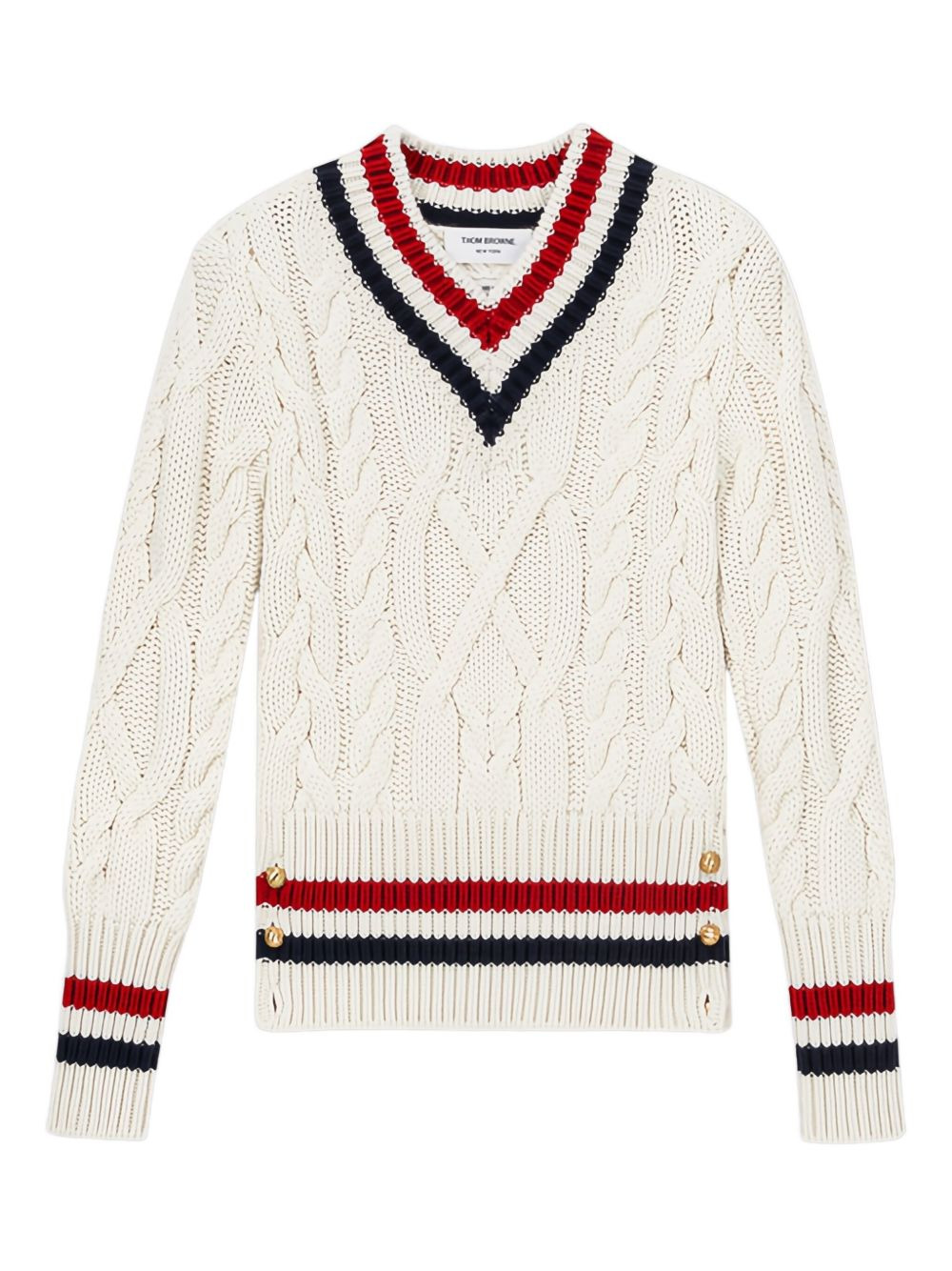 cable-knit V-neck pullover Highlights - Off-white - Cable knit - V-neck - Ribbed cuffs - Striped detailing - Gold-tone buttons Made in Italy Composition Cashmere 100% Washing instructions Read Manufacturer Guidelines