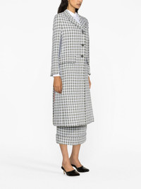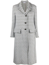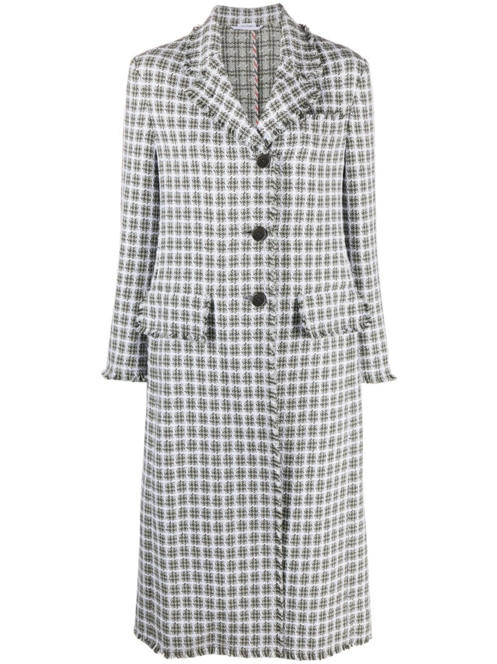check-pattern tweed coat Thom Browne continues to combine classic patterns with high-quality textured constructions, as seen in this single-breasted coat for the SS24 collection. Crafted in Italy, it is enlivened with a checked tweed that nods to the brand's aesthetic, while the signature grosgrain trims give the garment a branding twist. Highlights - Medium grey - Cotton - Tweed - Check pattern - Wide notch lapels - Front button fastening - Two front flap pockets - Signature grosgrain loop tab - Long sleeves - Buttoned cuffs - English rear vents - Straight hem - Below-knee length Made in Italy Composition Outer: Cotton 100% Lining: Cupro 100% SIZE & FIT Model measurements Height 5 ft 10 in(1.78 m) Bust/Chest 31.49 in(80 cm) Hips 35.03 in(89 cm) Waist 23.62 in(60 cm) FittingInformation Designed for a slim fit that sits just away from the body offering a close yet comfortable fit The vented hem offers movement at the rear Made from a midweight non-stretch fabric This piece fits true to size – take your usual size
