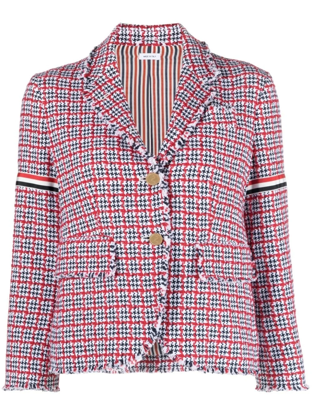 check-pattern tweed jacket Thom Browne aims to create a modern uniform through impeccably tailored pieces. Inspired by classic sports coats, this jacket is crafted in tweed in the brand's signature tricolour design. Highlights - Red/white/blue - Cotton - Tweed - Rwb stripe - Frayed edge - Notched collar - Front button fastening - Two front flap pockets - Long sleeves - Straight hem Made in Italy Composition Lining: Silk 100% Outer: Cotton 100%