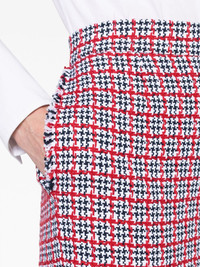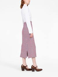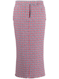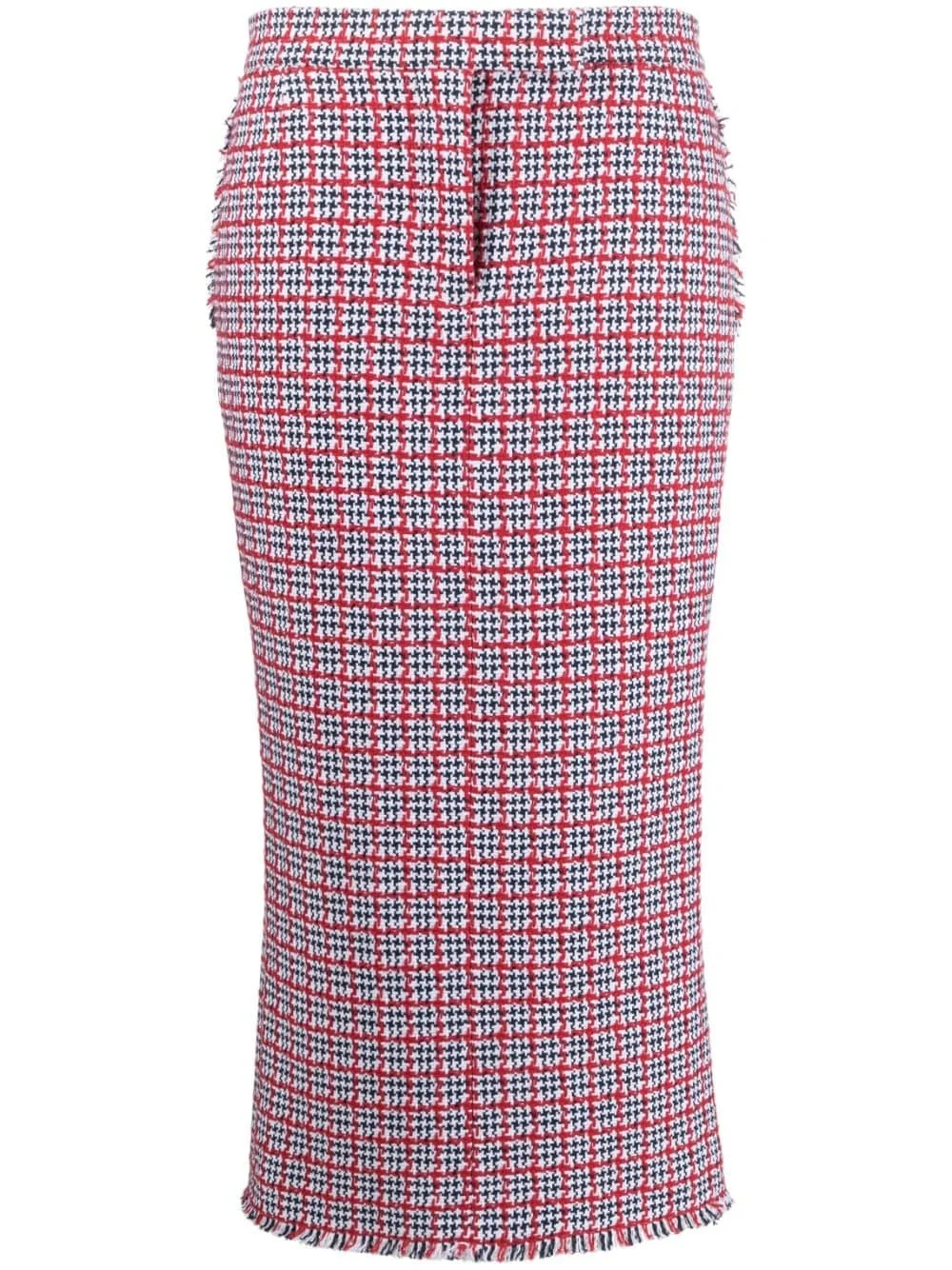 check-pattern tweed midi skirt Staying true to its signature house codes, Thom Browne presents this skirt. Spun from cotton, this piece showcases a frayed tweed construction in the same colourway as the label's signature RWB stripe - red, white and blue. Highlights - Red/white/blue - Cotton - Tweed - Frayed edge - Signature grosgrain loop tab - High waist - Flared - English rear vents - Silk lining Made in Italy Composition Lining: Silk 100% Outer: Cotton 100% SIZE & FIT Model measurements Height 5 ft 10 in(1.77 m) Bust/Chest 27.95 in(71 cm) Hips 33.85 in(86 cm) Waist 23.22 in(59 cm) FittingInformation This midi-length skirt is intended to be worn high on the waist Made from a midweight non-stretch fabric This piece fits true to size – take your usual size