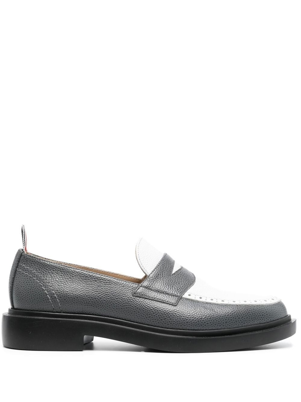 classic lightweight penny loafers grey/white calf leather/rubber perforated detailing signature grosgrain loop tab grained texture almond toe rubber sole Made in Italy Composition Leather 100% SIZE & FIT Measurement HEEL 1.18 in(3 cm) Sole height 0.39 in(1 cm)