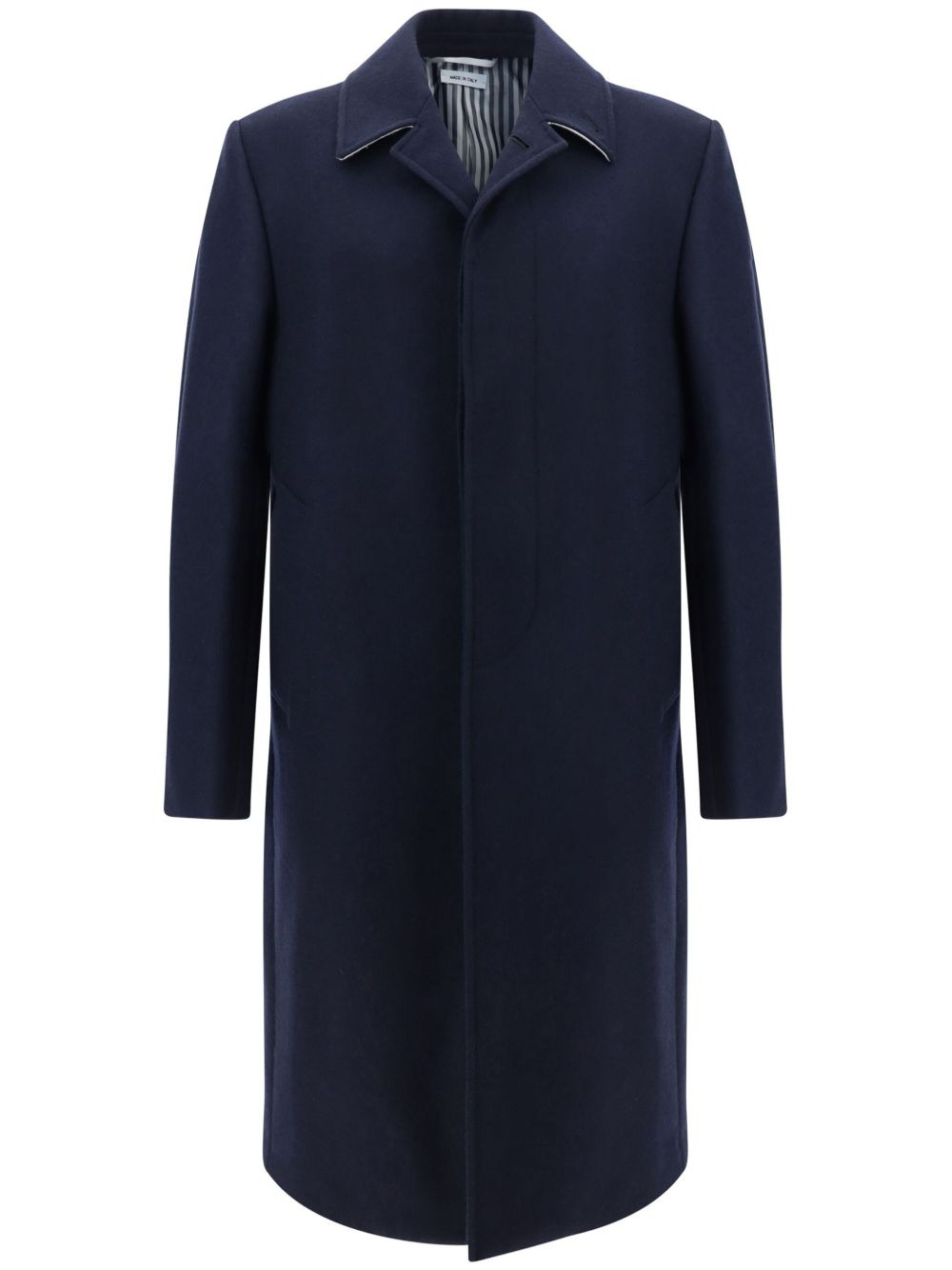 Melton wool coat Highlights - Navy blue - Wool - Navy blue - Wool - Brushed effect - Concealed front button fastening - Notched lapels - Long sleeves - Two side slit pockets - Signature grosgrain loop tab - Buttoned central rear vent - Striped lining Made in Italy Composition Wool 100%