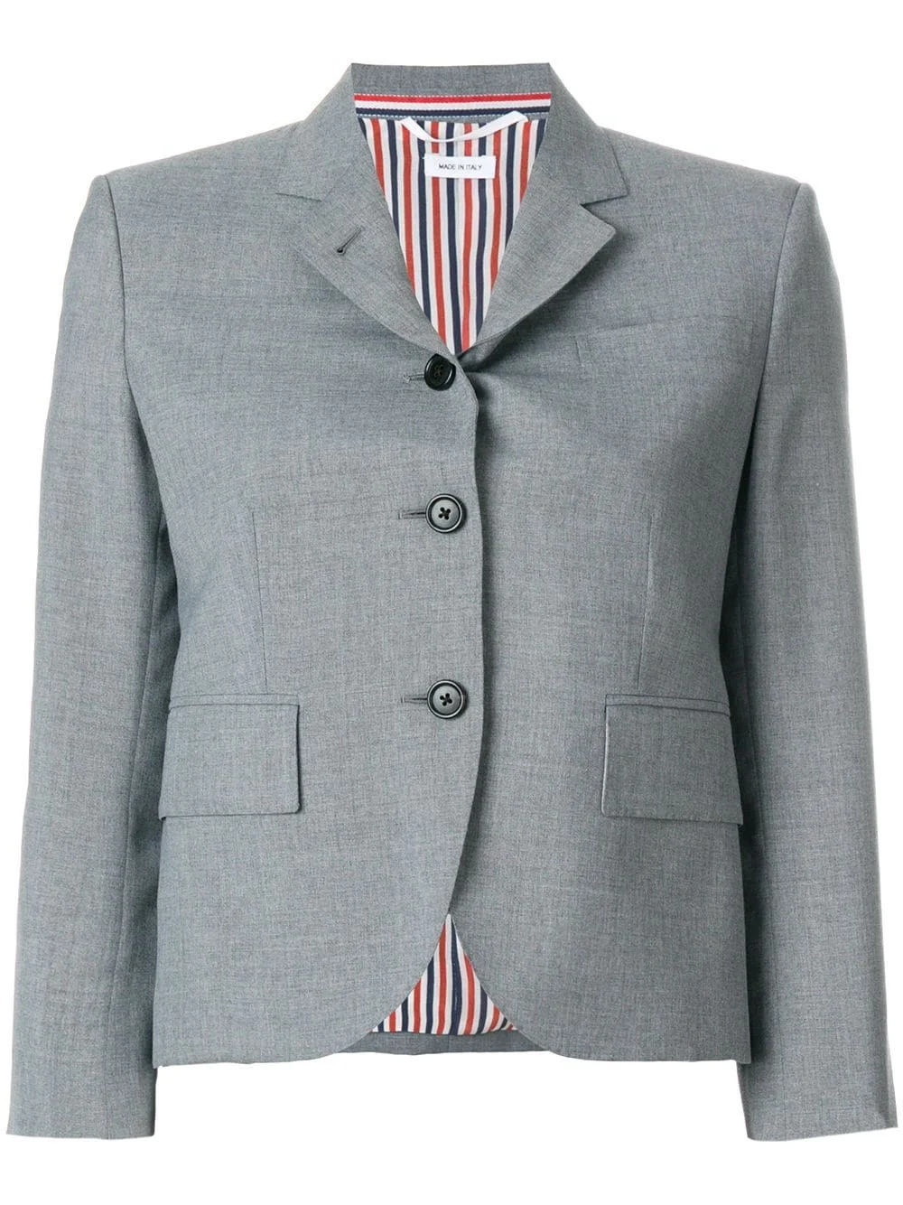 Classic Single Breasted Sport Coat In School Uniform Plain Weave With a history in men’s formalwear, Thom Browne brings its tailoring expertise to the table when creating its women’s collection, focusing on premium materials and expertly cut shapes. Smart and classic, this short structured blazer was crafted from a blend of grey wool, with a signature printed silk lining. Made in Italy, the country of fashion, it features notched lapels and a front button fastening. Its long sleeves have button cuffs with a grosgrain detail and, to the front, there's flap pockets and a broad welt chest pocket. A traditional double vent is placed to the rear, along with a red, white and blue grosgrain stripe and an internal locker loop. Made in Italy Composition Lining: Silk 100% Outer: Polyester 50%, Wool 50% Washing instructions Dry Clean Only