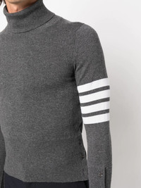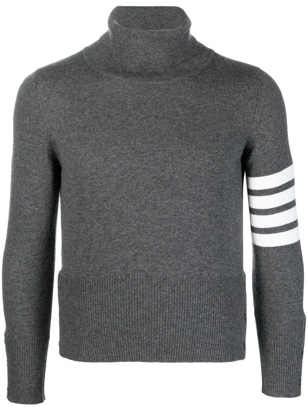 4-bar stripe cashmere turtleneck Highlights - Grey - Cashmere - Signature 4-bar stripe detail - Ribbed knit - Turtleneck - Long sleeves - Ribbed trim - Buttoned cuffs Made in United Kingdom Composition Cashmere 100% SIZE & FIT Model measurements Height 6 ft 2 in(1.89 m) Bust/Chest 37.79 in(96 cm) Hips 37 in(94 cm) Waist 29.92 in(76 cm) FittingInformation This piece fits true to size. We recommend you get your regular size Cut for a slim fit Made with a mid-weight fabric
