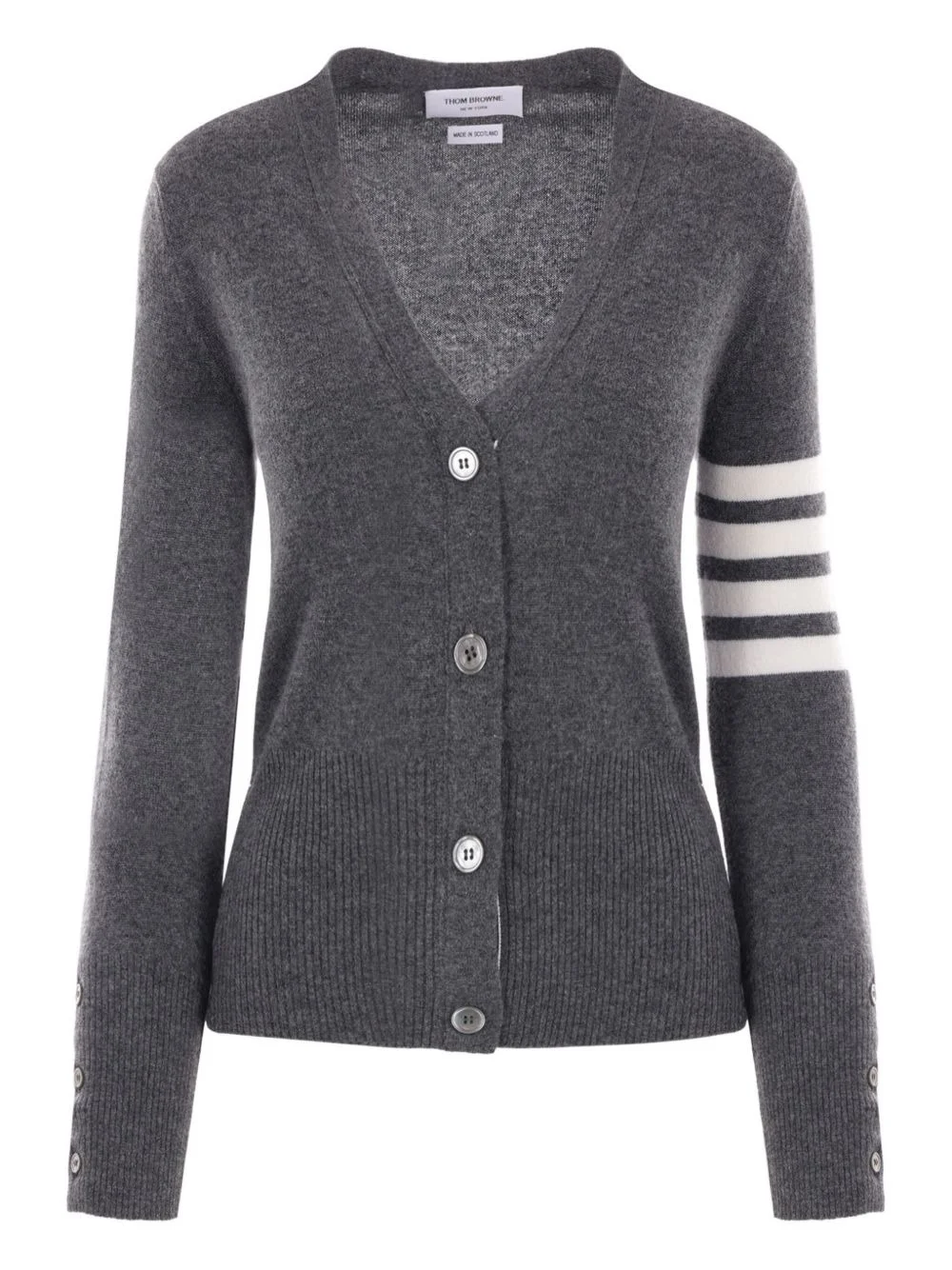 Classic V-Neck Cardigan In Cashmere With White 4-Bar Sleeve Stripe Highlights - Grey - V-neck - Cashmere Made in United Kingdom Composition Outer: Cashmere 100% SIZE & FIT Measurement Shoulder Width 12.59 in(32 cm) LENGTH 21.25 in(54 cm) BUST 28.34 in(72 cm) FittingInformation This piece fits true to size. We recommend you get your regular size Cut for a slim fit Made with a mid-weight fabric Washing instructions Dry Clean Only