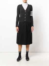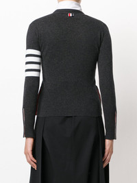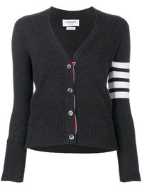 4-Bar V-neck cashmere cardigan Highlights - As renowned for his beloved knitwear as he is for his boundary-pushing tailoring, this knitted cardigan finds thom browne editing a familiar favourite with more athletically-inclined detailing. crafted in the united kingdom from soft cashmere, this sophisticated cardigan features a v-neck, a front button fastening, long sleeves, button cuffs, a ribbed hem and cuffs, 4-bar stripes at the sleeve, red, white and blue grosgrain cuffs detail and back yoke tab and side buttoned slits. Made in United Kingdom Composition Cashmere 100% SIZE & FIT Measurement LENGTH 20.86 in(53 cm) BUST 26.77 in(68 cm) Shoulder Width 12.2 in(31 cm) Washing instructions Dry Clean Only