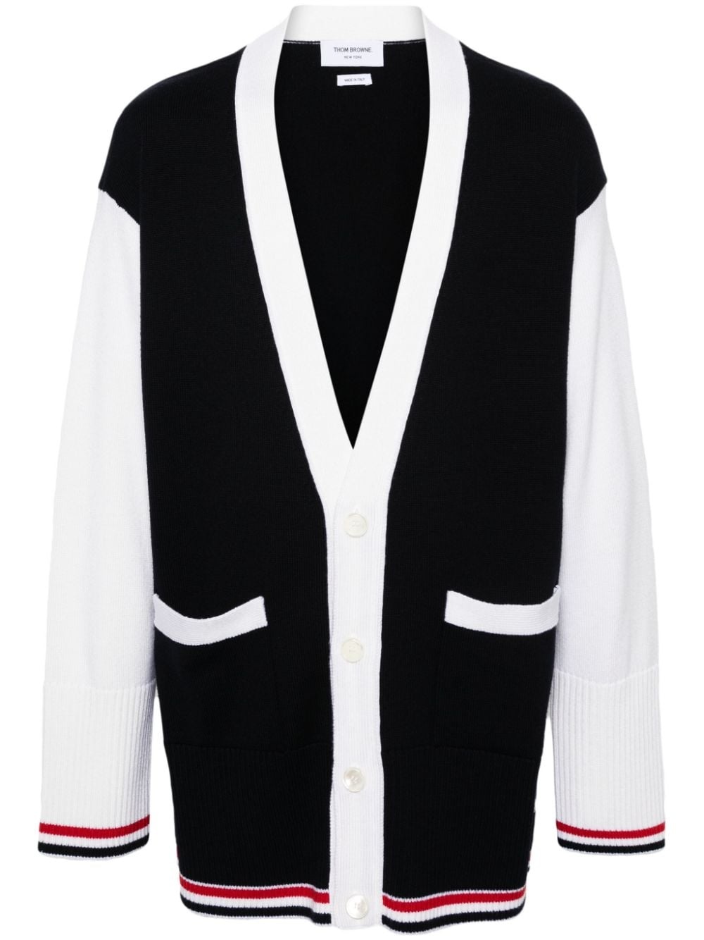colourblock virgin-wool cardigan Highlights - Navy blue, ivory white - Virgin wool - Fisherman's knit - Colour-block panelled design - Plunging v-neck - Drop shoulder - Long sleeves with striped buttoned cuffs - Two front patch pockets - Unlined - Ribbed hem - Spare button - Front button placket Made in Italy Composition Virgin Wool 100% SIZE & FIT Model measurements Height 6 ft 2 in(1.87 m) Bust/Chest 38.18 in(97 cm) Hips 36.61 in(93 cm) Waist 29.13 in(74 cm) FittingInformation Designed for a regular fit, offering a comfortable loose fit throughout the body Made with a midweight knit, this piece offers some stretch This piece fits true to size – take your usual size Washing instructions Dry Clean Only