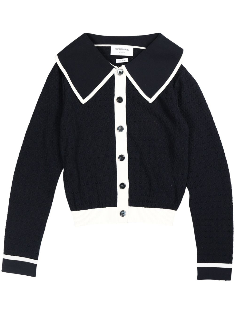 contrasting-trim pointelle-knit cotton cardigan Highlights - Navy blue - Cotton - Pointelle knit - Contrasting trim - Sailor collar - Front button fastening - Long sleeves - Ribbed cuffs and hem - Straight hem Made in Italy Composition Cotton 100% SIZE & FIT Measurement BUST 29.92 in(76 cm) LENGTH 18.89 in(48 cm) Shoulder Width 13.77 in(35 cm) SLEEVE LENGTH 23.62 in(60 cm) WAIST 29.92 in(76 cm)