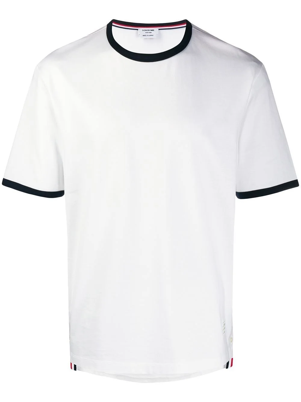 contrasting-trim T-shirt Give your regular white shirt a break. Boasting a soft cotton construction, this contrasting trim T-shirt is a little update for your basics section. Let Thom Browne upgrade you. Highlights - White - Cotton - Round neck - Short sleeves - Contrasting trim - Straight hem Imported Composition Cotton 100% SIZE & FIT Measurement CHEST 40.94 in(104 cm) Shoulder Width 19.29 in(49 cm) WAIST 40.94 in(104 cm)