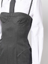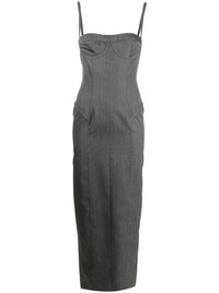 corset-style wool pencil dress corset-style wool pencil dress from THOM BROWNE featuring dark grey, wool, corset style, signature grosgrain loop tab, square neck, concealed rear zip fastening, sleeveless, rear slit and mid-length. Made in Italy Composition Lining: Silk 100% Outer: Wool 100% SIZE & FIT Model measurements Height 5 ft 10 in(1.77 m) Bust/Chest 35.03 in(89 cm) Hips 35.03 in(89 cm) Waist 23.62 in(60 cm) FittingInformation This piece fits true to size. We recommend you get your regular size Designed for a close fit at the bust, waist and hips Made with a mid-weight non-stretch fabric Washing instructions Dry Clean Only