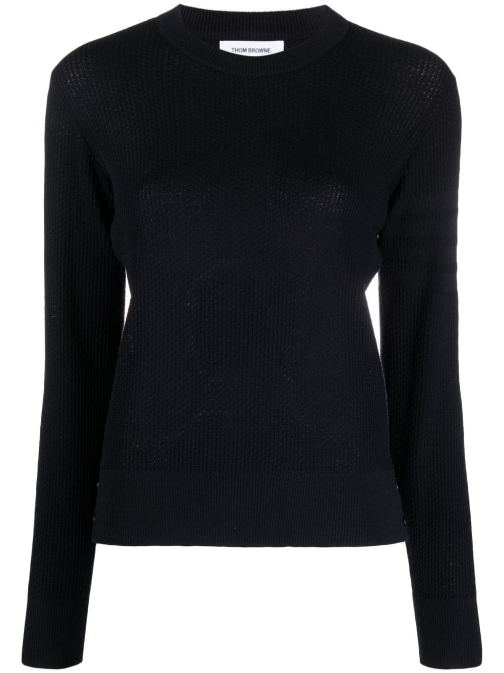 crew-neck virgin wool jumper Highlights - Navy blue - Virgin wool - Fine knit - Textured finish - Grosgrain ribbon trim - Crew neck - Long sleeves - Buttoned cuffs - Ribbed cuffs and hem - Side slits Made in Italy Composition Virgin Wool 100% SIZE & FIT Model measurements Height 5 ft 9 in(1.76 m) Bust/Chest 31.88 in(81 cm) Hips 35.43 in(90 cm) Waist 24.8 in(63 cm) FittingInformation Designed for a slim fit that sits just away from the body offering a close yet comfortable fit Made with a midweight knit, this piece offers some stretch This piece fits true to size – take your usual size