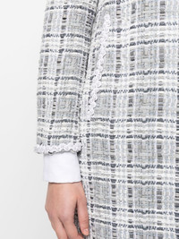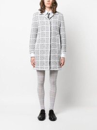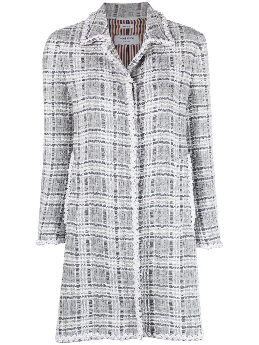 crochet-applique tweed coat medium grey silk tweed faux-pearl detailing crochet trim check pattern concealed front fastening notched collar long sleeves straight hem thigh-length Made in Italy Composition Outer: Polyester 30%, Acrylic 29%, Wool 21%, Viscose 14%, Polyamide 6% Lining: Silk 100% SIZE & FIT Model measurements Height 5 ft 10 in(1.79 m) Bust/Chest 32.67 in(83 cm) Hips 34.25 in(87 cm) Waist 24.4 in(62 cm) Washing instructions Dry Clean Only
