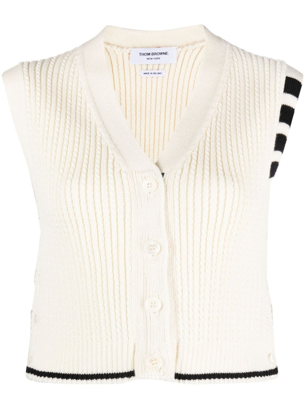 4-Bar stripe intarsia-knit vest Highlights - White/black - Virgin wool - Knitted construction - Cable knit - Strap detailing - Striped edge - Signature grosgrain loop tab - V-neck - Front button fastening - Sleeveless - Signature grosgrain side button fastening - Ribbed hem - Cropped Imported Composition Virgin Wool 100% SIZE & FIT Model measurements Height 5 ft 9 in(1.76 m) Bust/Chest 31.88 in(81 cm) Hips 35.43 in(90 cm) Waist 24.8 in(63 cm) Measurement LENGTH 18.5 in(47 cm) WAIST 27.55 in(70 cm) FittingInformation Designed for a slim fit that sits just away from the body offering a close yet comfortable fit Made with a midweight knit, this piece offers some stretch This piece fits true to size – take your usual size