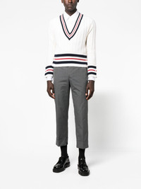 cropped straight-leg trousers These Thom Browne trousers are crafted from heavyweight twill to a tailored, straight-leg silhouette. They're fitted with an adjustable strap and a signature RWB tab at the back waist. Highlights - Grey - Twill weave - Mid-rise - Adjustable strap to the rear - Concealed front fastening - Straight leg - Two rear button-fastening jetted pockets - Turn-up hem - Cropped leg Imported Composition Lining: Cupro 100% Outer: Polyester 65%, Cotton 35% SIZE & FIT Model measurements Height 6 ft 2 in(1.87 m) Bust/Chest 36.41 in(92.5 cm) Hips 37 in(94 cm) Waist 29.52 in(75 cm) FittingInformation Designed for a straight-leg, allowing for an unrestricted and comfortable fit over the leg Cropped in length Made from a midweight non-stretch fabric This piece fits true to size – take your usual size