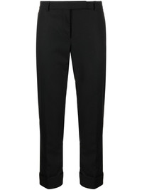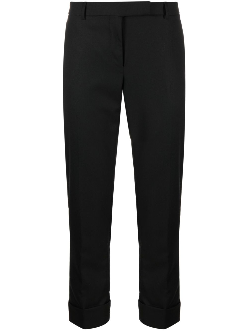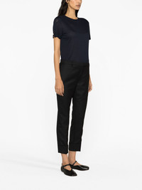 cropped tailored trousers Signature details of Thom Browne, such as the grosgrain loop tab makes this pair of trousers instantly recognisable as the brand. This is also highlighted through the use of a refined, minimalist palette. Highlights - Black - Wool - Cropped leg Made In Italy Composition Lining: Silk 100% Outer: Wool 100% SIZE & FIT Model measurements Height 5 ft 10 in(1.78 m) Bust/Chest 31.49 in(80 cm) Hips 35.03 in(89 cm) Waist 23.62 in(60 cm) FittingInformation Designed with a cigarette cut, these trousers allow for a close fit at the waist and offer an unrestricted fit through to the ankle Made from a midweight non-stretch fabric This piece fits true to size – take your usual size