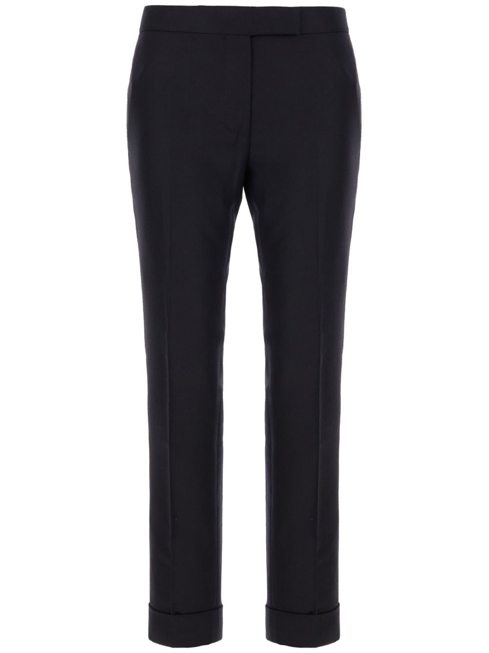 cropped tailored trousers Thom Browne's penchant for cropped tailored designs is evident in these trousers. Made from blue wool, this pair is a modern take on a classic pair, as it is designed with a slim cut and a cropped leg. Highlights - Blue - Wool - Low-rise - Pressed crease - Concealed front fastening - Two side slit pockets - Signature grosgrain loop tab - Two rear jetted pockets - Slim cut Made in Italy Composition Lining: Cupro 100%, Polyester 65%, Cotton 35% Outer: Wool 100% Washing instructions Read Manufacturer Guidelines