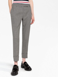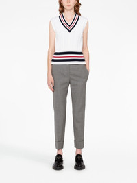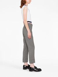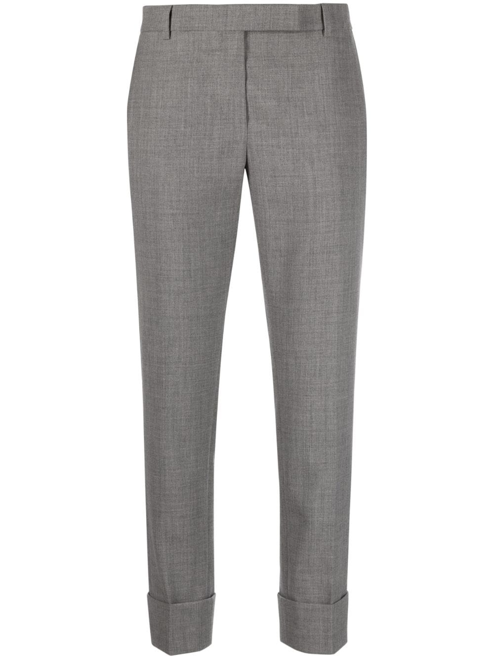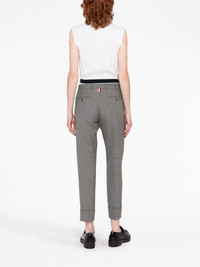 cropped tailored trousers Signature details of Thom Browne, such as the grosgrain loop tab makes this pair of trousers instantly recognisable as the brand. This is also highlighted through the use of a refined, minimalist palette. Highlights - Grey - Wool - Front button and zip fastening - Two side slit pockets - Cropped leg Made in Italy Composition Outer: Wool 100% Lining: Silk 100% SIZE & FIT Model measurements Height 5 ft 10 in(1.77 m) Bust/Chest 27.95 in(71 cm) Hips 33.85 in(86 cm) Waist 23.22 in(59 cm) FittingInformation Designed with a cigarette cut, these trousers allow for a close fit at the waist and offer an unrestricted fit through to the ankle Made from a midweight non-stretch fabric This piece fits true to size – take your usual size
