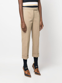 cropped tailored trousers cropped tailored trousers from THOM BROWNE featuring brown, cotton, pressed crease, concealed front fastening, straight leg, two side slash pockets and two rear welt pockets. Made in Italy Composition Cotton 100% SIZE & FIT Model measurements Height 5 ft 10 in(1.78 m) Bust/Chest 31.49 in(80 cm) Hips 37 in(94 cm) Waist 23.62 in(60 cm) FittingInformation This piece fits true to size. We recommend you get your regular size Cut for a slim fit Made with a mid-weight non-stretch fabric Washing instructions Dry Clean Only