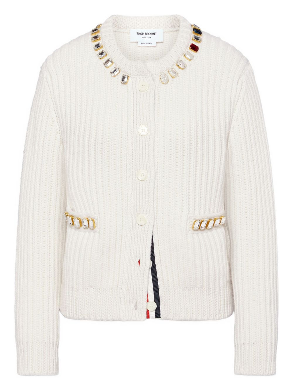Swarovski-crystal half-stitch cashmere cardigan Highlights - White - Crystal embellishment - Ribbed knit - Button fastening - Pocket detailing - Buttoned cuffs Made in Italy Composition Wool 100% Washing instructions Read Manufacturer Guidelines