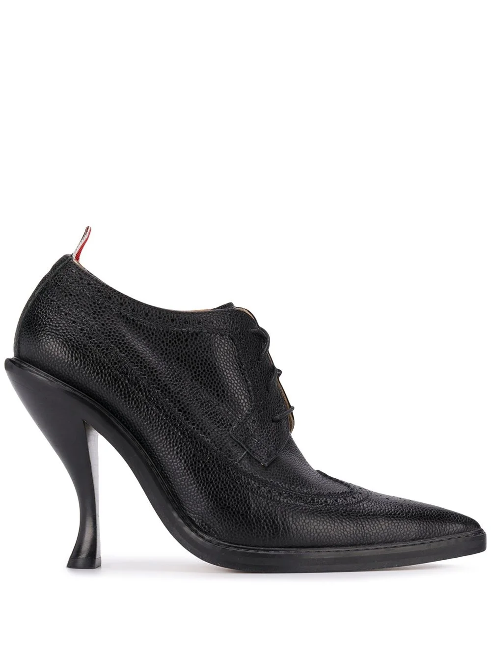 curved heel longwing brogues They're brogues...but not as you know them. Give your style a lift with this curved-heel pair from Thom Browne. Best foot forward. Highlights - Black - Pebbled leather - Punch-hole detailing - Signature grosgrain loop tab - Pebbled texture - Pointed toe - Front lace-up fastening - High sculpted heel Made in Italy Composition Outer: Calf Leather 100% Lining: Calf Leather 100% Sole: Calf Leather 100% SIZE & FIT Measurement Sole height 0.39 in(1 cm) HEEL 4.72 in(12 cm)