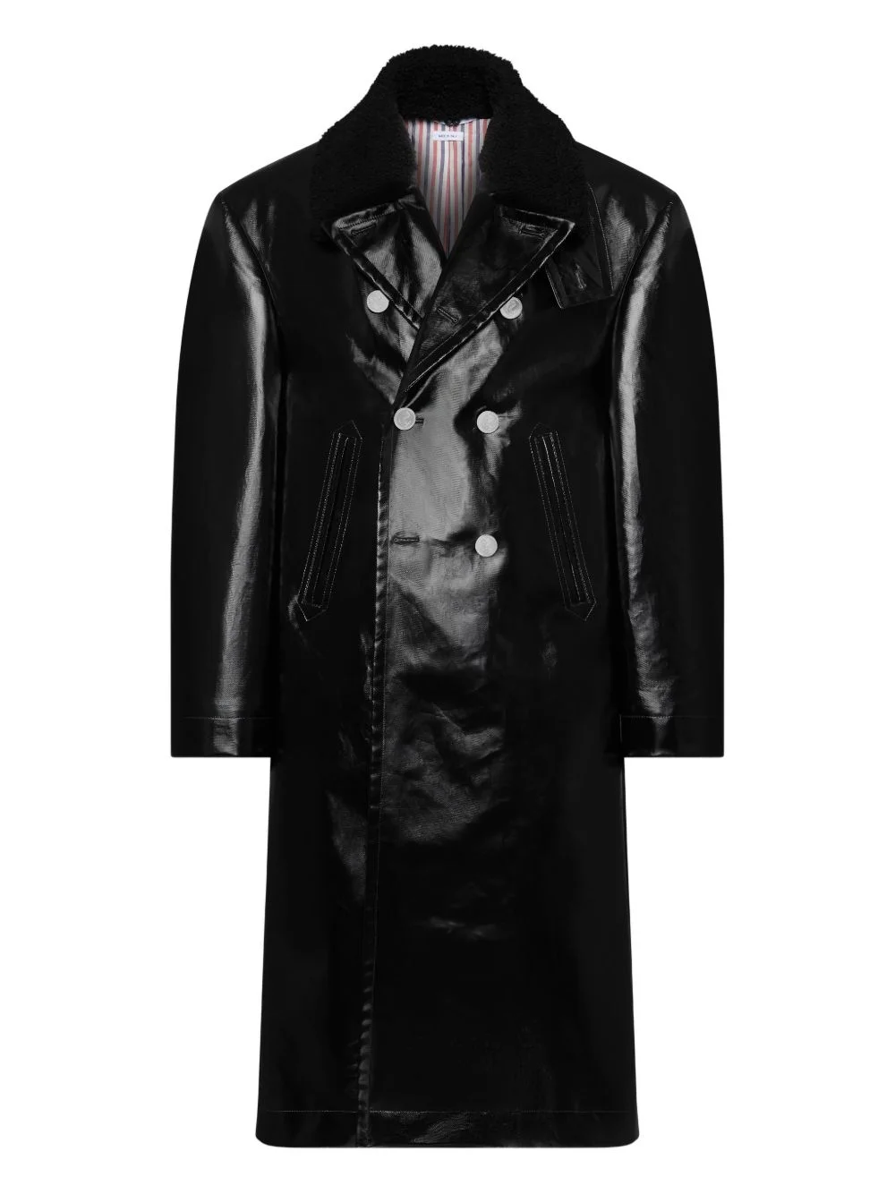 double-breasted leather coat Highlights - Black - Double-breasted - Button fastening - Side stripe - Detachable shearling collar - Long sleeves Made in Italy Composition Lining: Cupro 100% Outer: Goat Skin 100% Washing instructions Read Manufacturer Guidelines