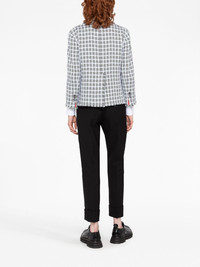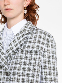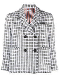 double-breasted tweed jacket Crafted from classic tweed, this Thom Browne blazer boasts a double-breasted closure that elevates its sophistication. The muted grey hue lends the design a touch of lightness. Highlights - Light grey - Cotton - Tweed - Check pattern - Frayed edge - Notched collar - Double-breasted button fastening - Long sleeves - Two front patch pockets Made in Italy Composition Outer: Cotton 100% Lining: Silk 100% SIZE & FIT Model measurements Height 5 ft 10 in(1.77 m) Bust/Chest 27.95 in(71 cm) Hips 33.85 in(86 cm) Waist 23.22 in(59 cm) Measurement SLEEVE LENGTH 24.4 in(62 cm) LENGTH 22.83 in(58 cm) WAIST 37 in(94 cm) BUST 36.22 in(92 cm) FittingInformation Designed for a relaxed fit, this piece allows for comfort and movement when worn Cropped in length Made from a midweight non-stretch fabric This piece fits true to size – take your usual size