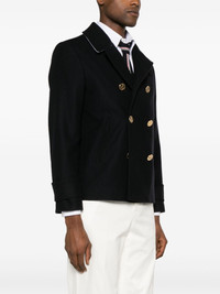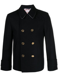 double-breasted wool peacoat Highlights - Navy blue - Virgin wool - Signature grosgrain loop tab - Gold-tone buttons - Contrasting under collar - Notched collar - Throat latch - Double-breasted button fastening - Long sleeves - Buttoned cuffs - Two side slit pockets - Rwb stripe lining - Internal logo patches - Internal jetted pockets - American rear vent - Straight hem Made in Italy Composition Outer: Virgin Wool 100% Lining: Cupro 100% SIZE & FIT Model measurements Height 6 ft 2 in(1.88 m) Bust/Chest 36.61 in(93 cm) Hips 35.82 in(91 cm) Waist 27.95 in(71 cm) FittingInformation Designed for a slim fit, offering a comfortable fit that sits just away from the body The internal shoulder pads offer a structured shape Made from a midweight non-stretch fabric This piece fits true to size – take your usual size