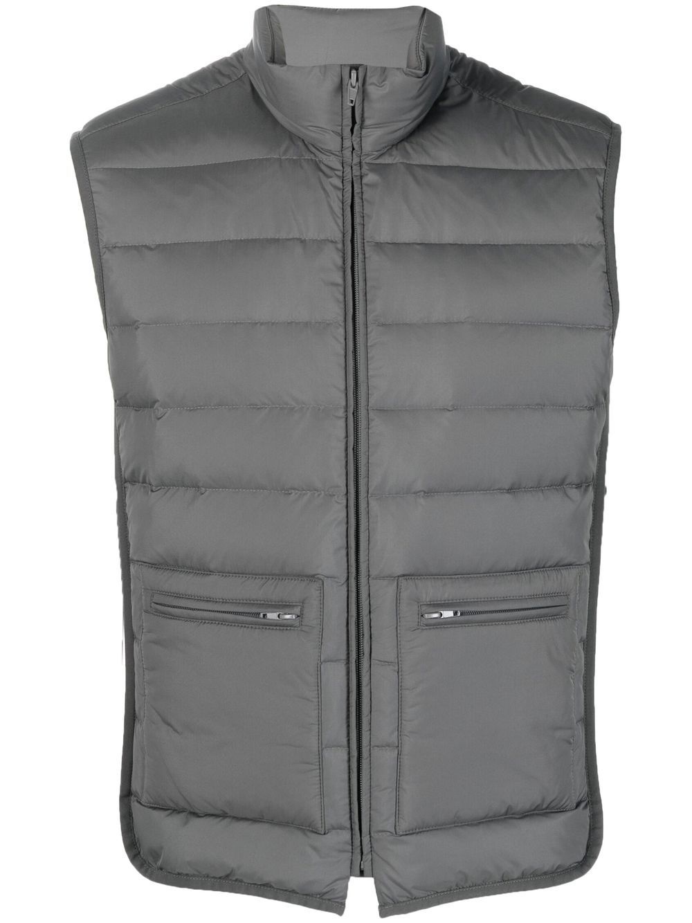 down-feather padded gilet Thom Browne transfers their polished aesthetic into a practical piece in this down feather-filled grey padded gilet. The refined design is injected with the brand's signature house codes, seen in the grosgrain loop tab to the rear and striped detailing at the sides. Highlights - Grey - Down-feather filling - Signature grosgrain loop tab - Quilted - Front zip fastening - Front zip fastening pockets - Sleeveless - Side stripe detailing - Curved hem Made in Italy Composition Lining: Feather Down 100%, Polyester 100% Outer: Polyester 100% SIZE & FIT Model measurements Height 6 ft 2 in(1.87 m) Bust/Chest 36.41 in(92.5 cm) Hips 37 in(94 cm) Waist 29.52 in(75 cm) Measurement CHEST 41.73 in(106 cm) LENGTH 25.19 in(64 cm) WAIST 40.15 in(102 cm) FittingInformation Designed for a slim fit, offering a comfortable fit that sits just away from the body Made from a padded non-stretch fabric, giving it no natural elasticity This piece fits true to size – take your usual size Washing instructions Dry Clean Only