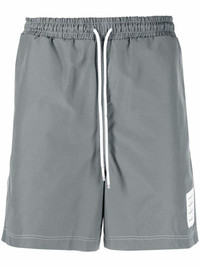drawstring-waist track shorts Known for their polished, tailored aesthetic, Thom Browne turns their hand to a more casual look in these grey-toned track shorts. Crafted from technical ripstop nylon, the loose cut and drawstring waist emphasise the relaxed nature of the pair. Made in Italy Composition Polyamide 100% SIZE & FIT Model measurements Height 6 ft 2 in(1.87 m) Bust/Chest 38.18 in(97 cm) Hips 36.61 in(93 cm) Waist 29.13 in(74 cm) FittingInformation This piece fits true to size. We recommend you get your regular size Designed for a slim fit at the waist and loose over the leg Made with a mid-weight non-stretch fabric