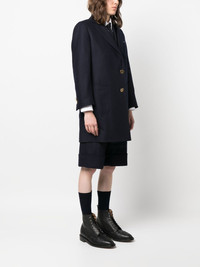 Engineered single-breasted side-stripe coat navy blue wool-cashmere blend side stripe detailing front button fastening classic lapels rear slit long sleeves chest patch pocket Made in Italy Composition Outer: Wool 95%, Cashmere 5% Lining: Cupro 100% SIZE & FIT Model measurements Height 5 ft 10 in(1.79 m) Bust/Chest 32.67 in(83 cm) Hips 34.25 in(87 cm) Waist 24.4 in(62 cm) FittingInformation This piece fits true to size. We recommend you get your regular size Cut for a loose fit Made with a mid-weight non-stretch fabric Washing instructions Dry Clean Only