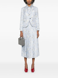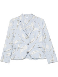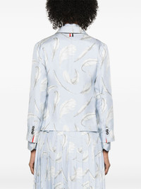 feather-print silk blazer Highlights - Baby blue - Front button fastening - Chest welt pocket - Long sleeves - Two front flap pockets Made in Italy Composition Outer: Silk 100% Lining: Silk 100% SIZE & FIT Model measurements Height 5 ft 11 in(1.8 m) Bust/Chest 31.49 in(80 cm) Hips 35.82 in(91 cm) Waist 24.8 in(63 cm) FittingInformation Designed for a slim fit that sits just away from the body offering a close yet comfortable fit The vented hem offers movement at the rear Made from a lightweight non-stretch fabric Measurement LENGTH 21.25 in(54 cm) WAIST 32.28 in(82 cm) BUST 35.43 in(90 cm) Shoulder Width 16.14 in(41 cm)