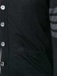 fine merino wool V-neck cardigan Thom Browne solves all your seasonal knitwear problems with this 4-Bar V-neck cardigan. Made from merino wool, this buttoned piece has been designed with the signature 4-Bar stripe and RWB grosgrain trim. Perfect for wearing year in, year out. Highlights - Black - Merino wool - Signature grosgrain loop tab - V-neck - Signature 4-bar stripe - Long sleeves - Front button fastening - Rwb stripe - Ribbed edge - Buttoned cuffs - Side button fastening Made in Italy Composition Merino 100% Outer: Wool 100% SIZE & FIT Model measurements Height 6 ft 2 in(1.87 m) Bust/Chest 38.18 in(97 cm) Hips 36.61 in(93 cm) Waist 29.13 in(74 cm) Measurement CHEST 37 in(94 cm) LENGTH 23.62 in(60 cm) SLEEVE LENGTH 22.83 in(58 cm) Washing instructions Dry Clean Only