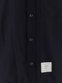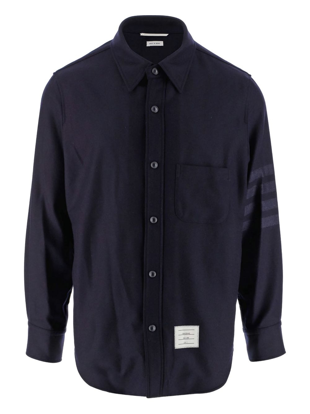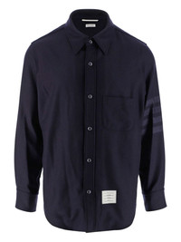 flannel tonal 4-Bar shirt jacket A signature house code, the 4-Bar stripe appears throughout Thom Browne's collections. It can be seen in a tonal colourway on the left sleeve of this navy blue shirt, which is spun from wool blend. Highlights - Meet the "creme de la creme" of what it means to be cool. made from a navy blue wool-cashmere blend, this flannel tonal 4-bar shirt jacket from thom browne is about to get you a ton of compliments. brace yourself. featuring a pointed collar, long sleeves, a chest pocket, a curved hemline, snap button cuffs, a front logo patch and a tricolour grosgrain tab on the rear. Made in Italy Composition Wool 95%, Cashmere 5% SIZE & FIT Measurement CHEST 42.51 in(108 cm) SLEEVE LENGTH 23.62 in(60 cm) Shoulder Width 17.71 in(45 cm) FittingInformation Designed to be unstructured, offering a loose fit throughout Made from a midweight non-stretch fabric This piece fits true to size – take your usual size Washing instructions Dry Clean Only