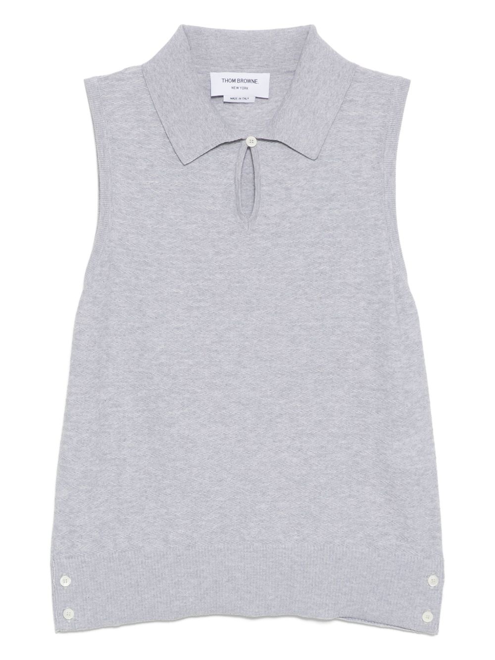 floated-cable polo Highlights - Grey - Polo collar - Keyhole neck - Sleeveless - Ribbed hem Made in Italy Composition Cotton 70%, Silk 30% SIZE & FIT Model measurements Height 5 ft 10 in(1.78 m) Bust/Chest 29.92 in(76 cm) Hips 34.64 in(88 cm) Waist 24.8 in(63 cm)