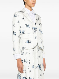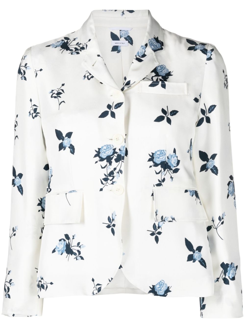 floral-print silk blazer Highlights - White/navy blue - Silk - All-over floral print - Notched lapels - Front button fastening - Long sleeves - Buttoned cuffs - Chest welt pocket - Two front flap pockets - English rear vents Made in Italy Composition Lining: Silk 100% Outer: Silk 100% SIZE & FIT Model measurements Height 5 ft 9 in(1.76 m) Bust/Chest 31.88 in(81 cm) Hips 35.43 in(90 cm) Waist 24.8 in(63 cm) FittingInformation Designed for a slim fit that sits just away from the body offering a close yet comfortable fit The vented hem offers movement at the rear Made from a midweight non-stretch fabric This piece fits true to size – take your usual size