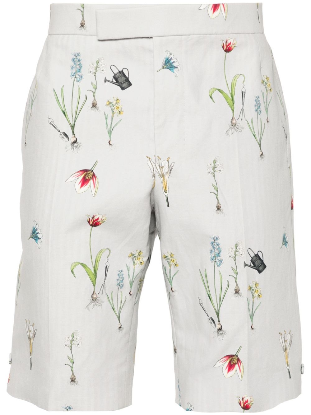 floral-print straight-leg shorts Highlights - Light grey/multicolour - All-over floral print - Two side inset pockets - Adjustable strap to the rear - Signature grosgrain loop tab - Two rear button-fastening jetted pockets - Short side slits - Decorative button detailing - Full lining - Straight leg - Concealed front button, hook and zip fastening Made in Italy Composition Fabric 100% SIZE & FIT Model measurements Height 6 ft 2 in(1.88 m) Bust/Chest 35.03 in(89 cm) Hips 35.82 in(91 cm) Waist 27.95 in(71 cm) FittingInformation A slim-fit design that sits comfortably just away from the leg Made from a midweight non-stretch fabric This piece fits true to size – take your usual size