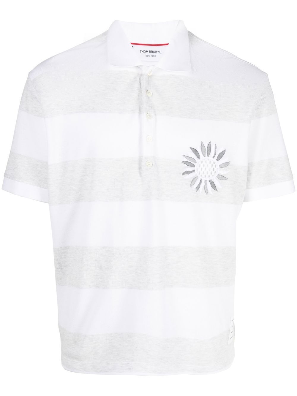 flower-embroidered striped polo shirt Thom Browne introduces a refreshing twist to their typically preppy aesthetic in this polo shirt design. Woven from cotton in a tonal greyscale stripe, the embroidered flower at the chest rejuvenates the piece. Made in Italy Composition Cotton 100% SIZE & FIT Model measurements Height 6 ft 2 in(1.87 m) Bust/Chest 36.41 in(92.5 cm) Hips 37 in(94 cm) Waist 29.52 in(75 cm) FittingInformation This piece fits true to size. We recommend you get your regular size Cut for a relaxed fit Made with a mid-weight fabric Washing instructions Dry Clean Only