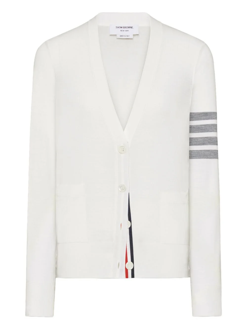 four-bar merino-wool cardigan Highlights - White - Four-bar stripe detail - V-neck - Button-front fastening - Patch pockets - Merino wool Made in United Kingdom Composition Virgin Wool 100% Washing instructions Dry Clean Only