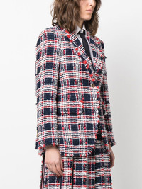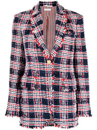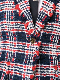 frayed single-breasted tweed blazer red/white/blue silk tweed check pattern frayed detailing embossed gold-tone buttons notched lapels buttoned cuffs long sleeves straight hem Made in Italy Composition Lining: Silk 100% Outer: Polyester 48%, Acrylic 31%, Viscose 14%, Wool 7% SIZE & FIT Model measurements Height 5 ft 10 in(1.79 m) Bust/Chest 32.67 in(83 cm) Hips 34.25 in(87 cm) Waist 24.4 in(62 cm) FittingInformation This piece fits true to size. We recommend you get your regular size Cut for a slim fit Made with a mid-weight non-stretch fabric Washing instructions Dry Clean Only