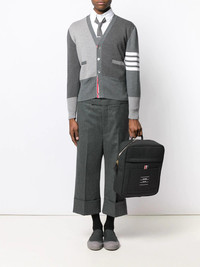 Fun-Mix merino cardigan The classic Thom Browne silhouette is instantly recognisable: the jacket is cut narrow, the trousers are cropped short and everything bar the tricolour strip is monochrome, as showcased by this tonal grey wool Fun-Mix V-neck merino cardigan. Featuring a v-neck, long sleeves, ribbed details, a straight hem, a front button fastening, two front pockets, a tricolour grosgrain tab on the rear and striped details to the left sleeve. Made in United Kingdom Composition Wool 100% SIZE & FIT Model measurements Height 6 ft 2 in(1.88 m) Bust/Chest 36.61 in(93 cm) Hips 35.82 in(91 cm) Waist 27.95 in(71 cm) Washing instructions Hand Wash