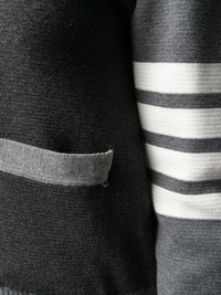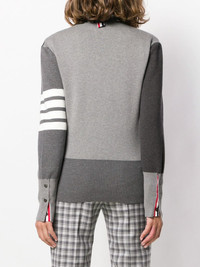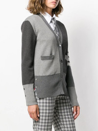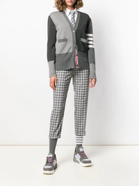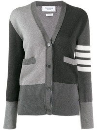 Funmix 4-Bar v-neck cardigan Knitwear has come a long way style-wise. And we're inclined to thank this Funmix 4-Bar v-neck cardigan for that. Slip on this Thom Browne piece and make an impression. Highlights - Grey/white - Cotton - Signature grosgrain loop tab - V-neck - Contrasting panel detail - Signature 4-bar stripe - Long sleeves - Front button fastening - Buttoned cuffs - Rwb stripe - Two front pockets Made in Italy Composition Cotton 100% SIZE & FIT Model measurements Height 5 ft 9 in(1.75 m) Bust/Chest 32.67 in(83 cm) Hips 36.22 in(92 cm) Waist 24.8 in(63 cm) FittingInformation This piece fits true to size. We recommend you get your regular size Cut for a relaxed fit Made with a mid-weight fabric Measurement SLEEVE LENGTH 23.22 in(59 cm) LENGTH 22.44 in(57 cm) Washing instructions Dry Clean Only