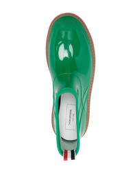 Garden ankle boots A sophisticated take on classic wellie boots, Thom Browne imagines the practical pair in an ankle-length silhouette. Signature RWB stripe details add a recognisable touch. Highlights - Fern green - High-shine finish - Signature grosgrain loop tab - Rwb stripe - Round toe - Pull-on style - Ridged rubber sole Made in Italy Composition Sole: Rubber 100% Outer: Rubber 100% Lining: Fabric 100%, Calf Leather 100% SIZE & FIT Measurement HEEL 1.96 in(5 cm) Sole height 1.37 in(3.5 cm)