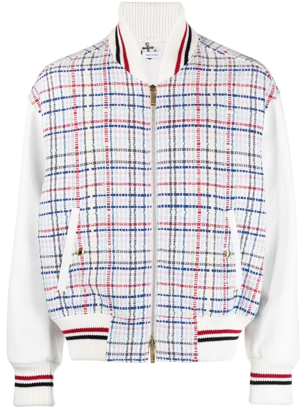 gingham-check bomber jacket Thom Browne puts a modern twist on tweed with this bomber jacket. Detailed with multicolour checks, it forms part of this bomber jacket for relaxed appeal. Made in Italy Composition Outer: Acrylic 38%, Polyester 26%, Cotton 13%, Viscose 13%, Polyamide 4%, Silk 1% Lining: Cupro 100%, Viscose 100% Wool 5% SIZE & FIT Model measurements Height 6 ft 2 in(1.88 m) Bust/Chest 36.61 in(93 cm) Hips 35.82 in(91 cm) Waist 27.95 in(71 cm) FittingInformation This piece fits true to size. We recommend you get your regular size Cut for a loose fit Made with a mid-weight fabric