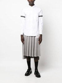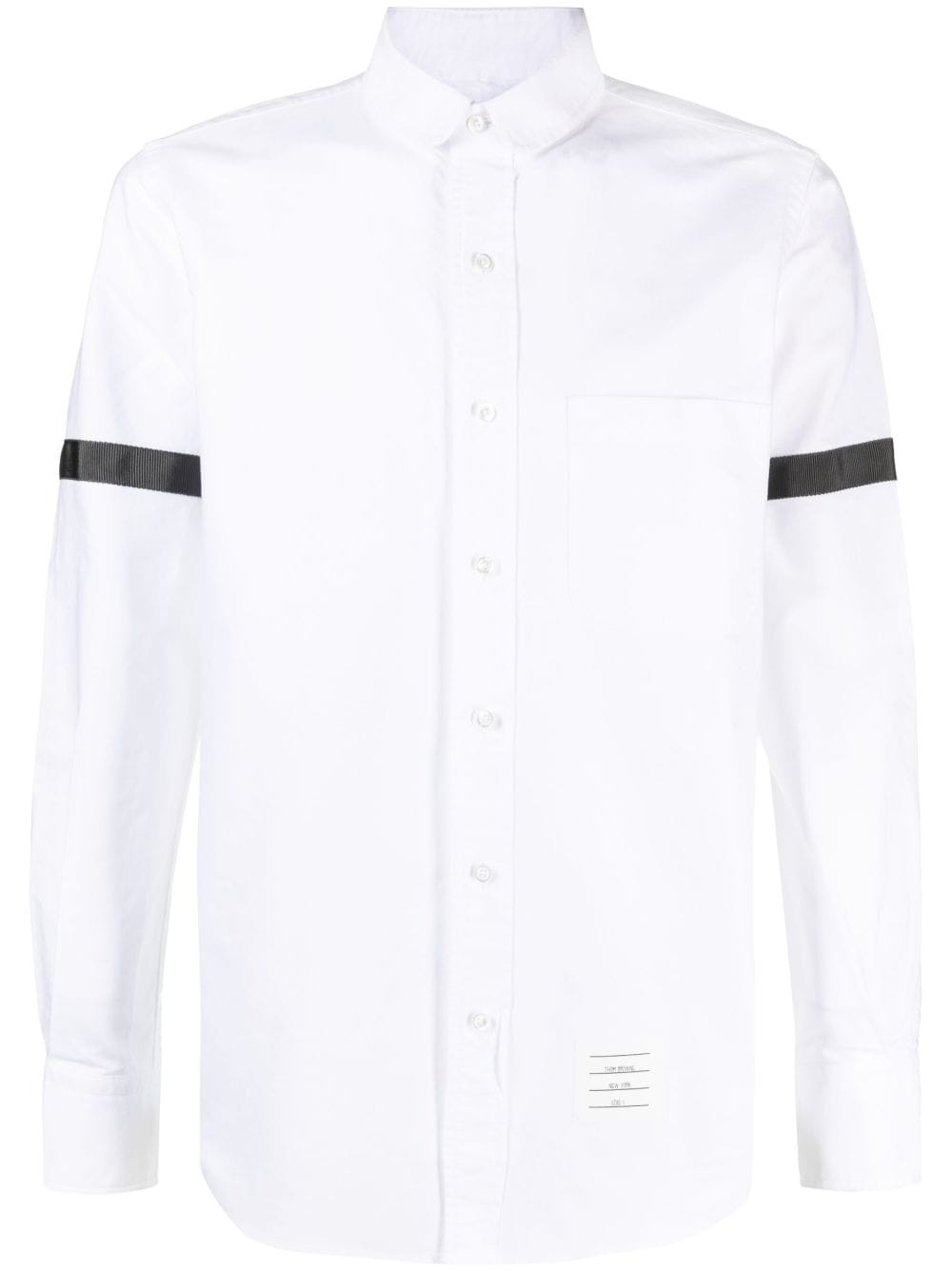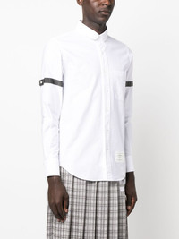 grosgrain-armband cotton shirt Renowned for enhancing classic designs with signature house details, Thom Browne presents this shirt. The long-sleeve design is defined by its contrasting grosgrain armbands and is enhanced with a logo patch to the front and signature grosgrain loop tab at the nape. Highlights - White - Cotton - Grosgrain armbands - Logo patch to the front - Front button fastening - Rounded collar - Signature grosgrain loop tab - Long sleeves - Curved hem - Rwb stripe Made in Italy Composition Outer: Cotton 100% SIZE & FIT Model measurements Height 6 ft 2 in(1.87 m) Bust/Chest 36.41 in(92.5 cm) Hips 37 in(94 cm) Waist 29.52 in(75 cm) FittingInformation Designed for a regular fit, allowing for a comfortably loose fit throughout the body Made from a midweight non-stretch fabric This piece fits true to size – take your usual size