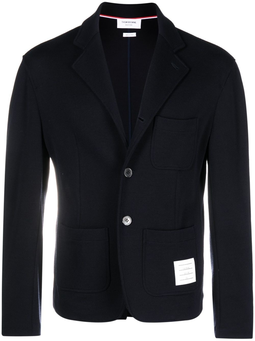single-breasted button-fastening blazer Instantly recognisable as Thom Browne by the signature grosgrain loop, this button-fastening cardigan is constructed from sophisticated materials and has a sleek silhouette that reflects the brand's tailored approach to garment construction. Highlights - Navy blue - Round neck - Long sleeves - Front button fastening - Signature grosgrain loop tab Made in Italy Composition Virgin Wool 100% SIZE & FIT Model measurements Height 6 ft 2 in(1.87 m) Bust/Chest 36.41 in(92.5 cm) Hips 37 in(94 cm) Waist 29.52 in(75 cm) FittingInformation Designed for a slim fit, offering a comfortable fit that sits just away from the body Made with a midweight knit, this piece offers some stretch This piece fits true to size – take your usual size