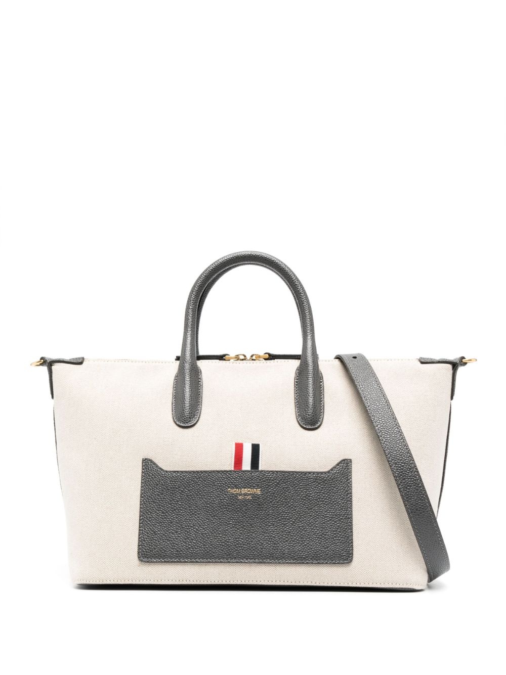 grosgrain-loop tote bag Instantly recognisable as Thom Browne by the signature grosgrain loop, this logo-print tote bag is constructed from sophisticated materials and has a sleek silhouette that reflects the brand's tailored approach to garment construction. Highlights - Beige - Logo print to the front - Signature grosgrain loop tab - Main compartment - Two top handles Made in Italy Composition Outer: Cotton 100%, Calf Leather 100% Lining: Cotton 100% SIZE & FIT Model measurements Height 6 ft 2 in(1.87 m) Bust/Chest 36.41 in(92.5 cm) Hips 37 in(94 cm) Waist 29.52 in(75 cm) Measurement DEPTH 6.69 in(17 cm) HANDLE 3.14 in(8 cm) HEIGHT 7.87 in(20 cm) STRAP 19.68 in(50 cm) WIDTH 14.56 in(37 cm)