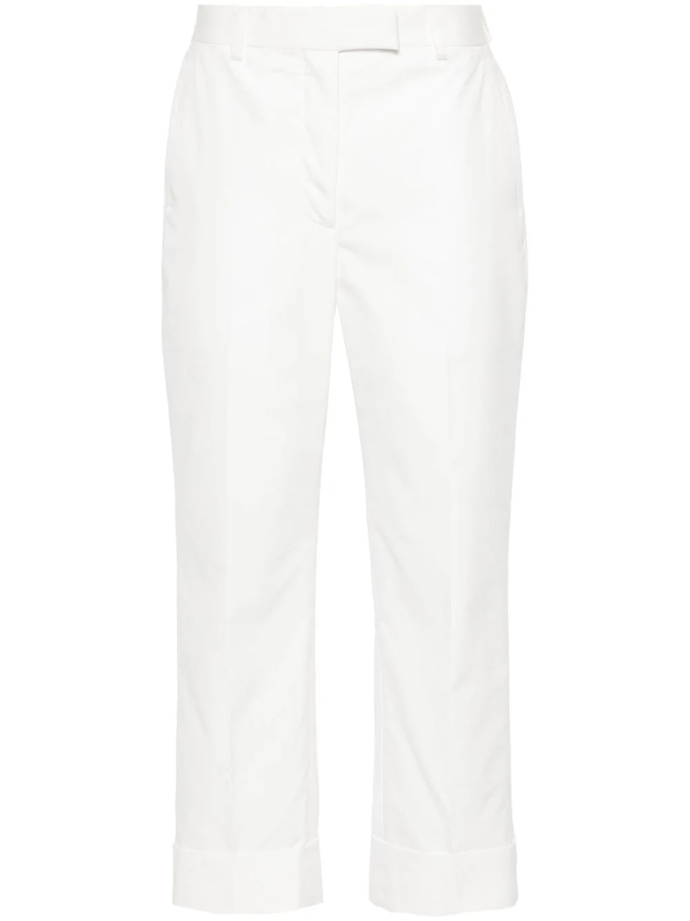 high-waisted tailored trousers Highlights - White - Cotton - Signature 4-bar tab - Pressed crease - High-waisted - Belt loops - Concealed front button, hook and zip fastening - Tailored cut - Two side slit pockets - Two rear button-fastening pockets - Turn-up cuffs Made in Italy Composition Cotton 100% SIZE & FIT Model measurements Height 5 ft 11 in(1.8 m) Bust/Chest 32.67 in(83 cm) Hips 36.22 in(92 cm) Waist 24.4 in(62 cm) FittingInformation Designed for a tapered fit, these trousers allow for a close fit at the waist and a loose unrestricted fit over the leg with a closer fit towards the ankle Cropped in length Made from a midweight non-stretch fabric This piece fits true to size – take your usual size